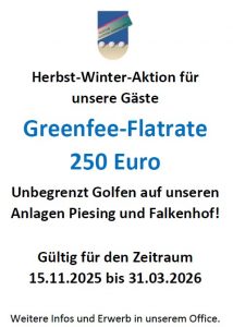 Plätze geöffnet / Drivingranges geöffnet / Carts erlaubt / Duschen in Betrieb /Hunde angeleint erlaubt +++ Turnierkalender 2025 (PDF) ist online +++ Unsere nächsten Turnier-Highlights: 6.12. Nikolaus-Cup / 31.12. Silvester-Turnier +++ Team Harry gewinnt den Piesinger Ryder Cup 2025 +++ Winter Greenfee-Flatrate für Gäste +++ Unsere Öffnungszeiten sind in den Wintermonaten eingeschränkt